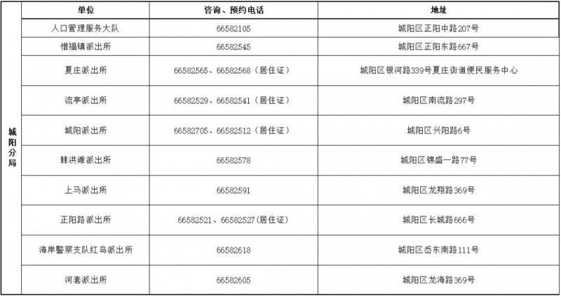 青岛市城阳区户政便民服务窗口:城阳区人口管理服务大队户政窗口和各辖区派出所户籍窗口地址及咨询预约电话