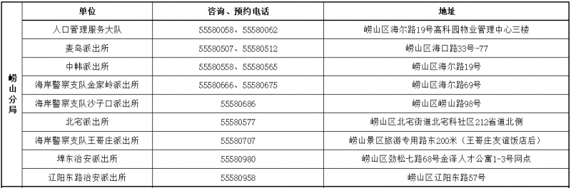 青岛市崂山区户政便民服务窗口:崂山区人口管理服务大队户政窗口和各辖区派出所户籍窗口地址及咨询预约电话