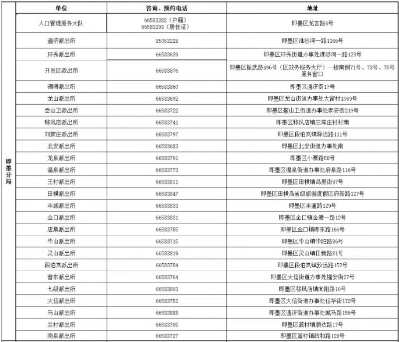 青岛市即墨区户政便民服务窗口:即墨区人口管理服务大队户政窗口和各辖区派出所户籍窗口地址及咨询预约电话