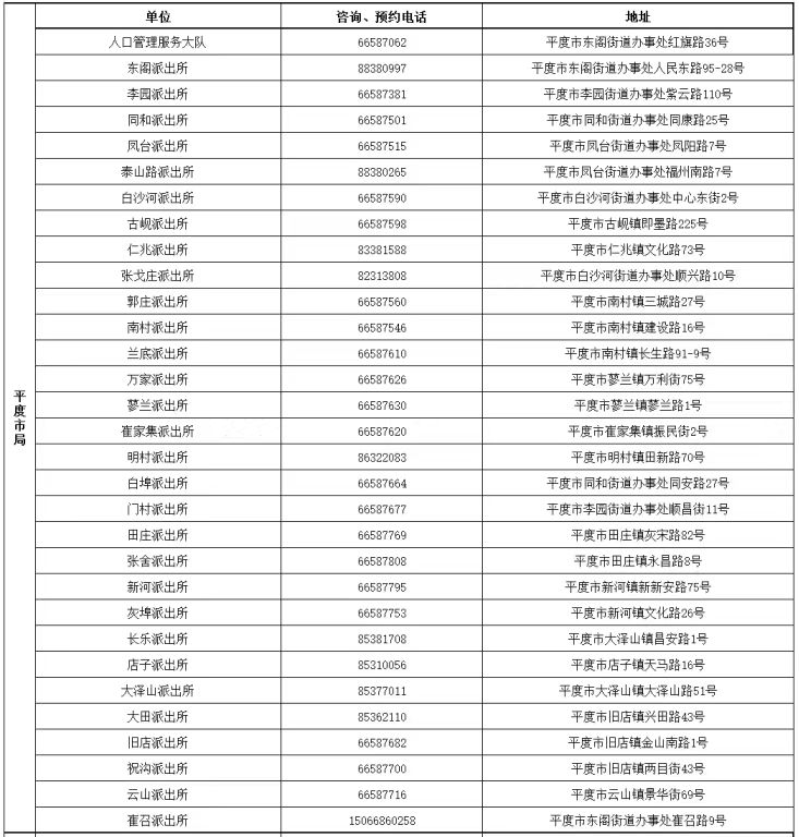 青岛平度市户政便民服务窗口:平度市人口管理服务大队户政窗口和各辖区派出所户籍窗口地址及咨询预约电话