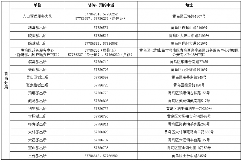 黄岛区政务服务中心窗口咨询电话:0532-(隐珠派出所户籍办理窗口)57786256(居住证)/57766237(身份证)、57766239(户籍),地址: