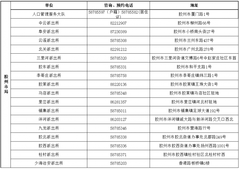 青岛胶州市户政便民服务窗口:胶州市人口管理服务大队户政窗口和各辖区派出所户籍窗口地址及咨询预约电话