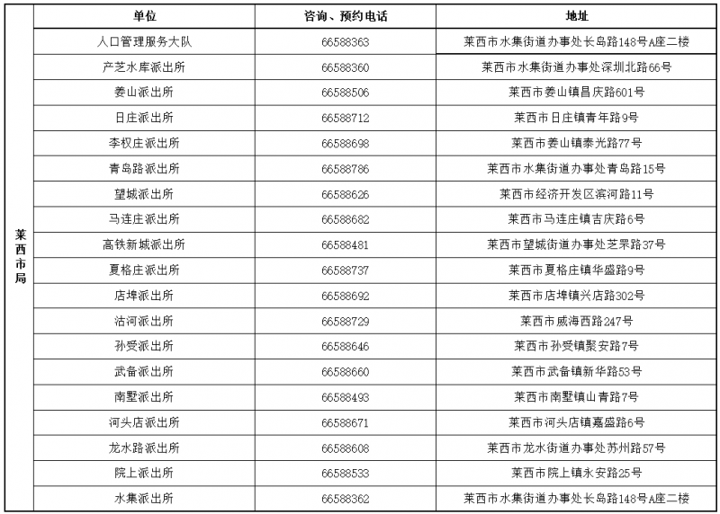 青岛莱西市户政便民服务窗口:莱西市人口管理服务大队户政窗口和各辖区派出所户籍窗口地址及咨询预约电话