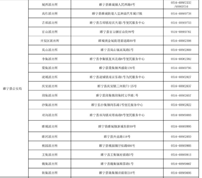 睢宁县各派出所户籍窗口办理身份证地址和咨询电话