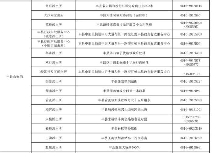 丰县各辖区派出所户籍窗口办理身份证地址和咨询电话