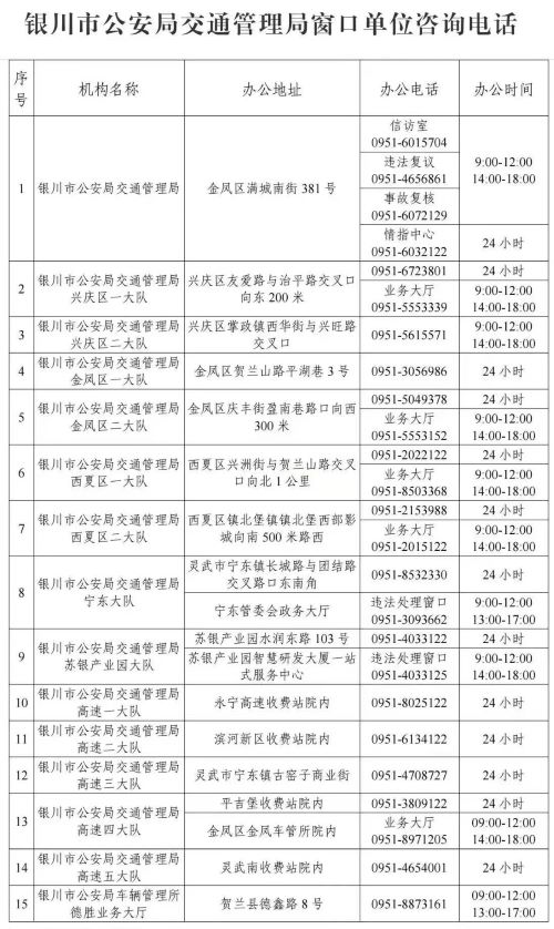 银川市全市交通管理局服务窗口单位办公地址和办公电话信息表
