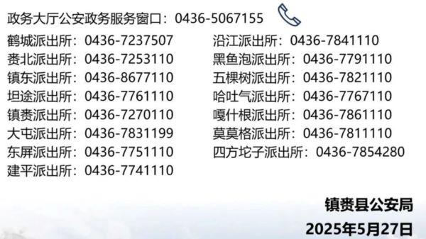 说明:关于镇赉县六个派出所综合窗口户籍身份证业务咨询热线电话的信息仅供参考。