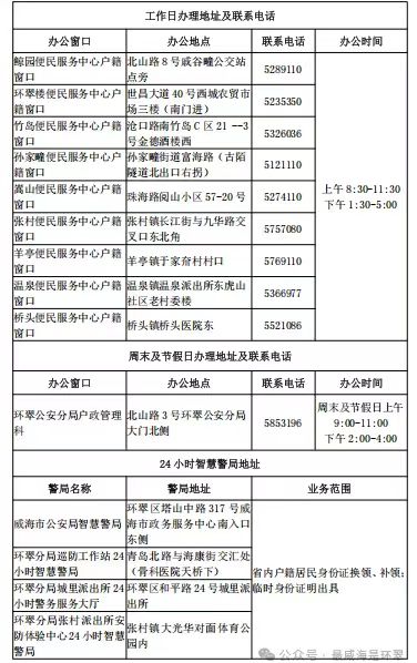 说明:关于威海市环翠区户政管理科窗口和派出所户籍窗口办公地址和联系电话信息作出免责声明,此信息图文仅供参考,小编不承担任何法律责任。此信息来源于有关机构的公开内容,在此经过整理并转载,唯一的目的是通过互联网传播便民惠民信息。由于时间等原因,难免使信息发生变更,此信息如有侵权,或者差错,请联系删除,直接联系便民信息平台秋果黄页网客服电话(187-8199-3958微信同号),一定会及时删除和修正。