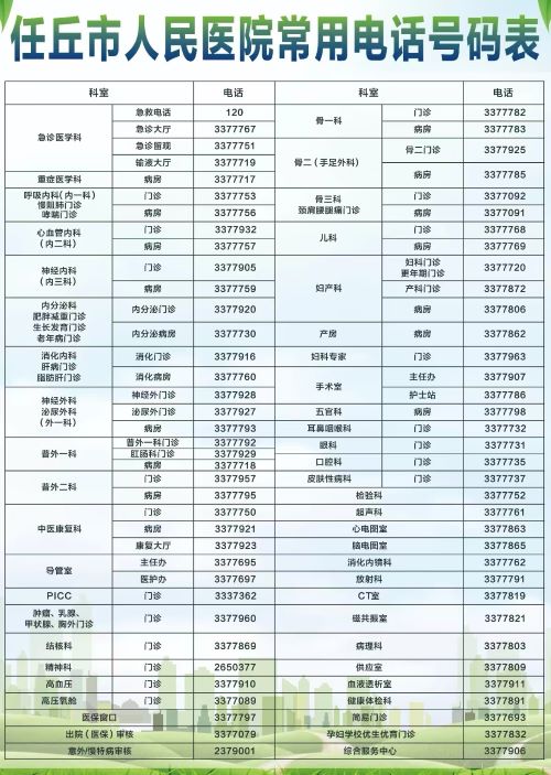 任丘市人民医院科室常用业务电话号码表