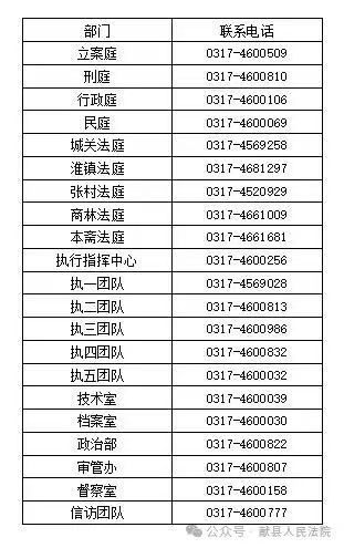 献县人民法院联系电话一键查,便民司法在身边。为进一步深化司法公开,落实便民利民举措,畅通群众沟通渠道,献县法院向社会公布各部门及派出法庭的工作电话。群众可根据需求在工作时间内联系相关庭室咨询业务、反映问题。