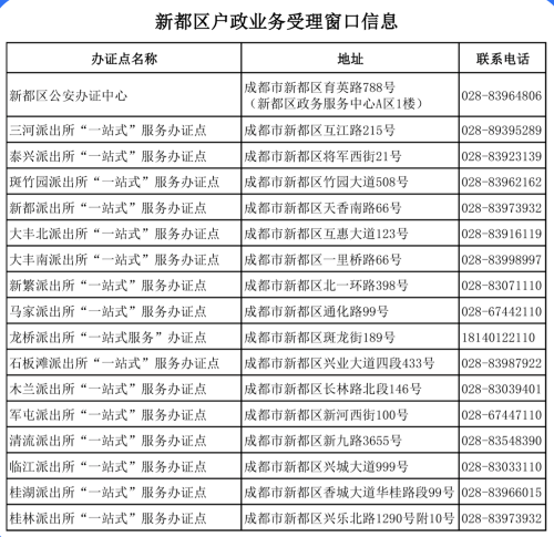说明:关于成都市新都区户政业务受理窗口(派出所办证窗口)信息作出免责声明,此信息图文仅供参考,小编不承担任何法律责任。此信息来源于有关机构的公开内容,在此经过整理并转载,唯一的目的是通过互联网传播便民惠民信息。由于时间等原因,难免使信息发生变更,此信息如有侵权,或者差错,请联系删除,直接联系便民信息平台客服电话(187-8199-3958微信同号),一定会及时删除和修正。