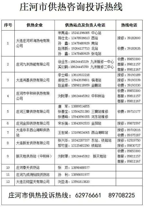一,庄河市供暖供热咨询热线:为方便广大业户咨询供热相关问题,反馈诉求,现将庄河市供热服务热线整理如下,有需要的小伙伴赶紧收藏转发吧。